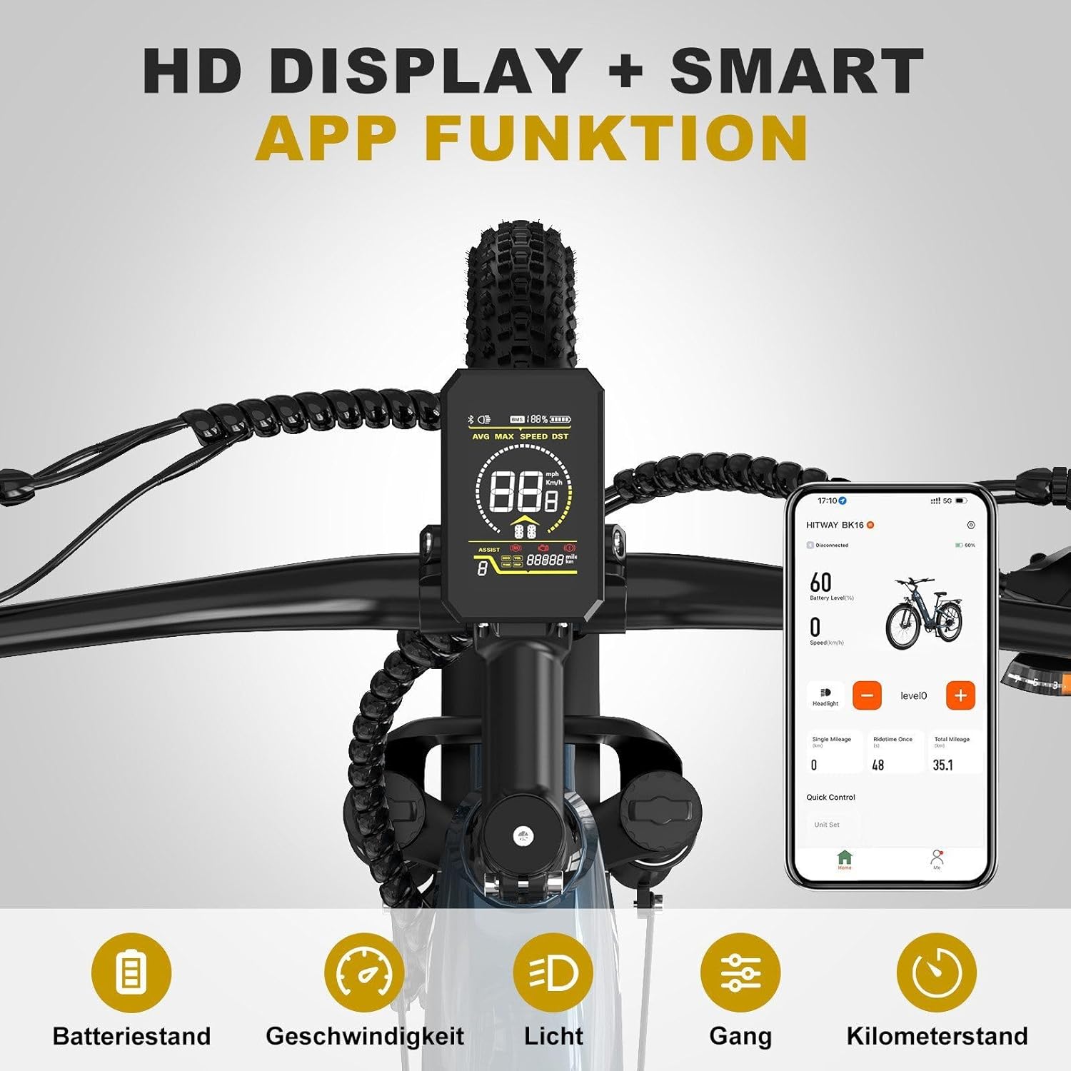 • 21700 Lithium-Akku: Entfesseln Sie die Leistung unseres HITWAY BK16 E-Bikes mit seinem 48 V 18 Ah 21700 Lithium-Akku mit großer Kapazität. Von Kurztrips bis hin zu längeren Fahrten bietet BK16 E-Bikes eine beeindruckende Reichweite von 55–80 km. Erleben Sie längere Fahrzeiten und verbesserte Leistung für Ihre täglichen Pendelfahrten oder gemütlichen Fahrten.