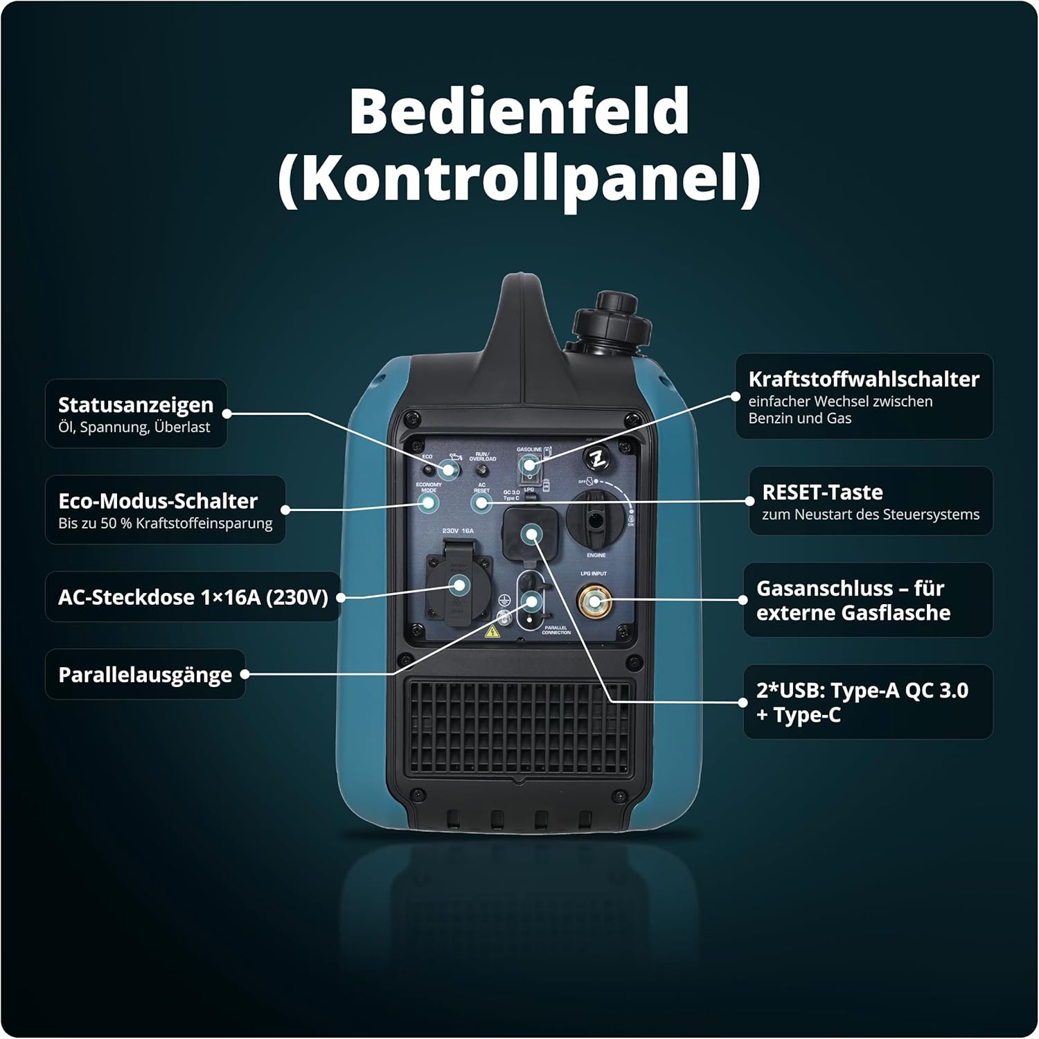 • Inverter Stromaggregat – Unterstützt den Parallelbetrieb von zwei Inverter-Stromerzeugern zur Erhöhung der Gesamtleistung bei höherem Energiebedarf.