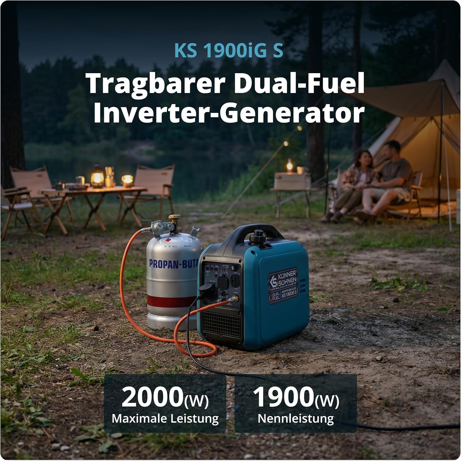 Könner & Söhnen KS 1900iG S Inverter Stromerzeuger, 2.000W, Dual Fuel LPG/Benzin, reine Sinuswelle, 17kg, Eco-Mode, USB, Euro-5