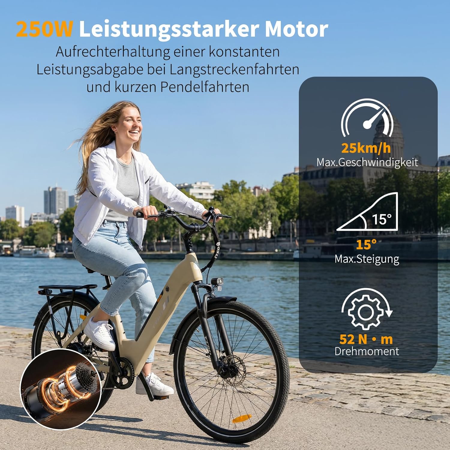 - 【Leistungsstarker Motor】Dieses C3 SE Elektrofahrrad für Erwachsene verfügt über einen robusten 250W Hochgeschwindigkeits-Bürstenlosmotor mit einem maximalen Drehmoment von 52 Nm und einer Höchstgeschwindigkeit von 25 km/h. Es bewältigt mühelos flaches Gelände und leichte Steigungen und ist somit eine ausgezeichnete Wahl für den täglichen Weg zur Arbeit und kurze Fahrten.