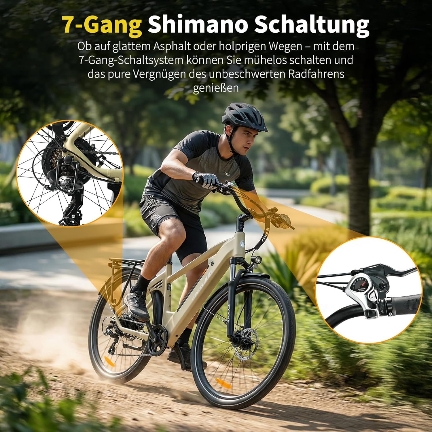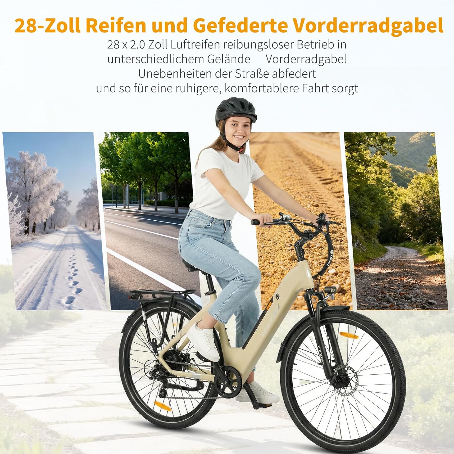 - 【Leichter und robuster Fahrradgestell sowie 28 Zoll Reifen】 Dieses Elektrofahrrad für Erwachsene verfügt über einen leichten und robusten Rahmen aus 6061 Aluminiumlegierung (185 x 66 x 117 cm) und wiegt 25 kg. Ausgestattet mit 28*2,0-Reifen, die eine starke Haftung und hohe Verschleißfestigkeit bieten und für alle Straßenbeläge geeignet sind, sorgt es für hervorragende Traktion und Stabilität. Die maximale Tragkraft beträgt 120 kg und ist für verschiedene Körpergrößen geeignet.